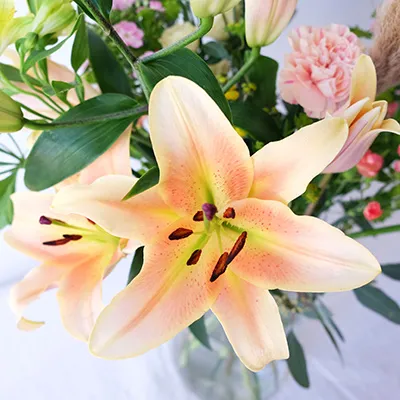 Los lirios rosados evocan romanticismo, dulzura y delicadeza. Son perfectos para crear un ambiente acogedor y femenino. Combínalos con: