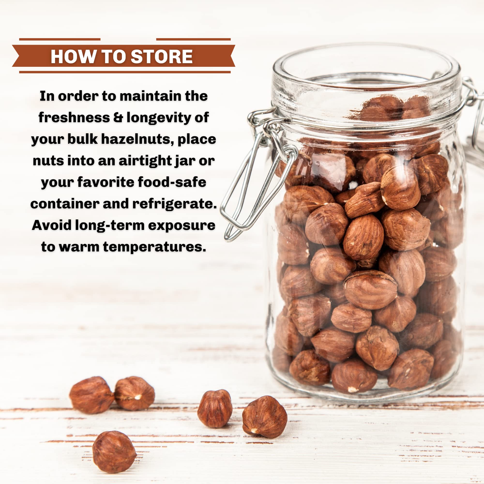 - ¿Puedo almacenar avellanas con cáscara en frascos de vidrio? Sí, pero la cáscara ofrece una capa protectora adicional contra la oxidación. Sin embargo, las avellanas sin cáscara se deterioran más rápido.