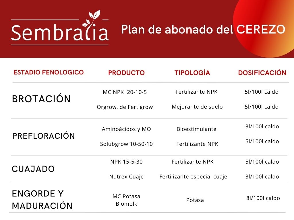 El abonado debe ser adaptado a la época del año. En primavera, cuando el cerezo comienza su crecimiento vegetativo, se necesita un abonado rico en nitrógeno. En otoño, después de la cosecha, se recomienda un abonado con mayor proporción de fósforo y potasio para fortalecer el árbol y prepararlo para el invierno.